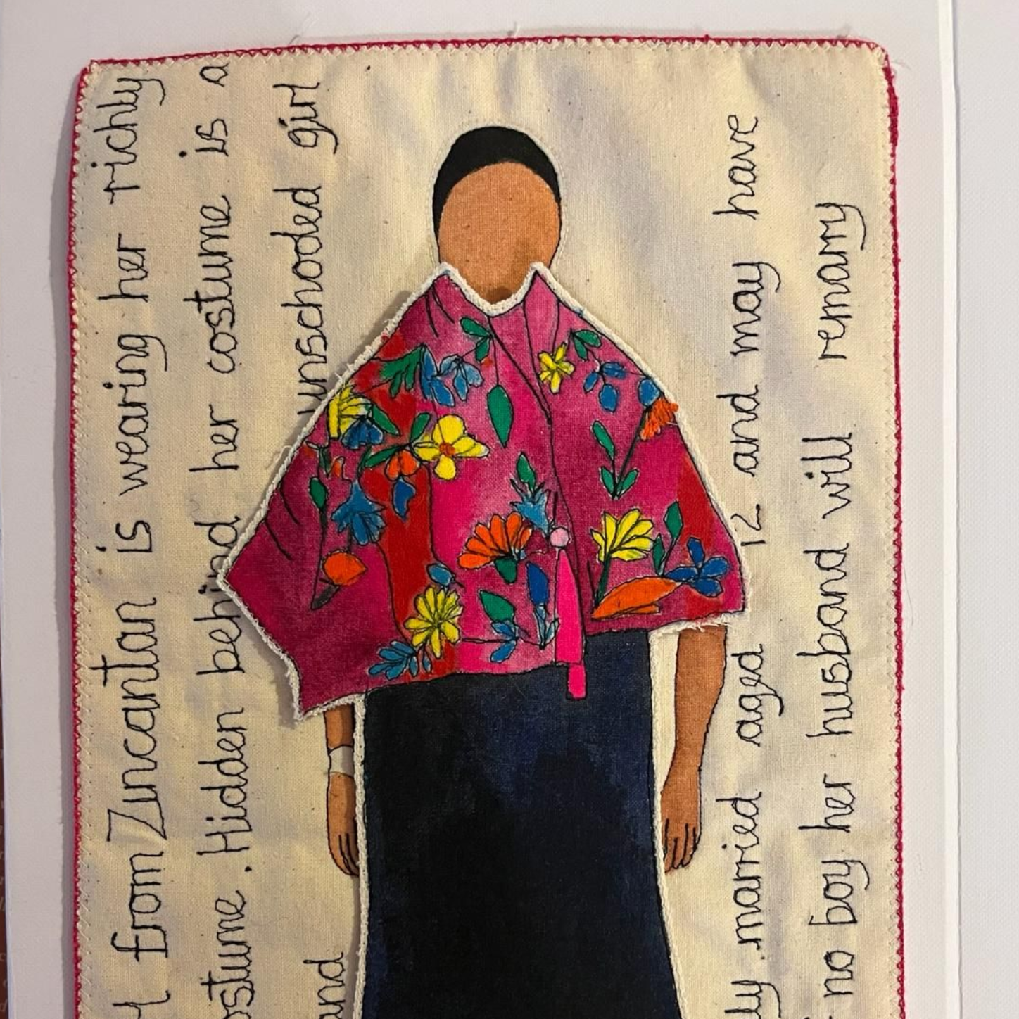 It is a type of counted thread embroidery, stitching it we are recreating stitches that have been used by Mayan women for many, many centuries.