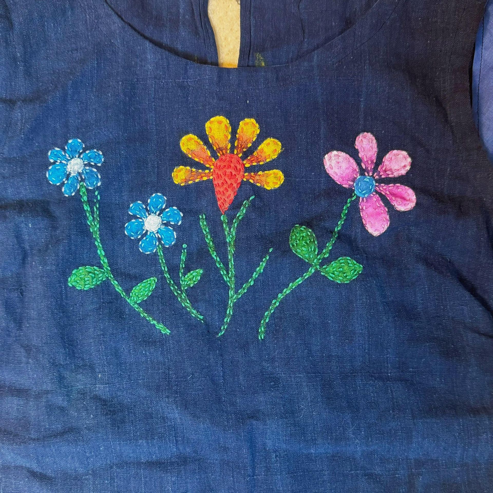 Working from what we see in museums and daily life, we create our own piece on a linen blouse, combining painted imagery with hand stitching. Florals are a favourite, though there’s space to follow your own direction.